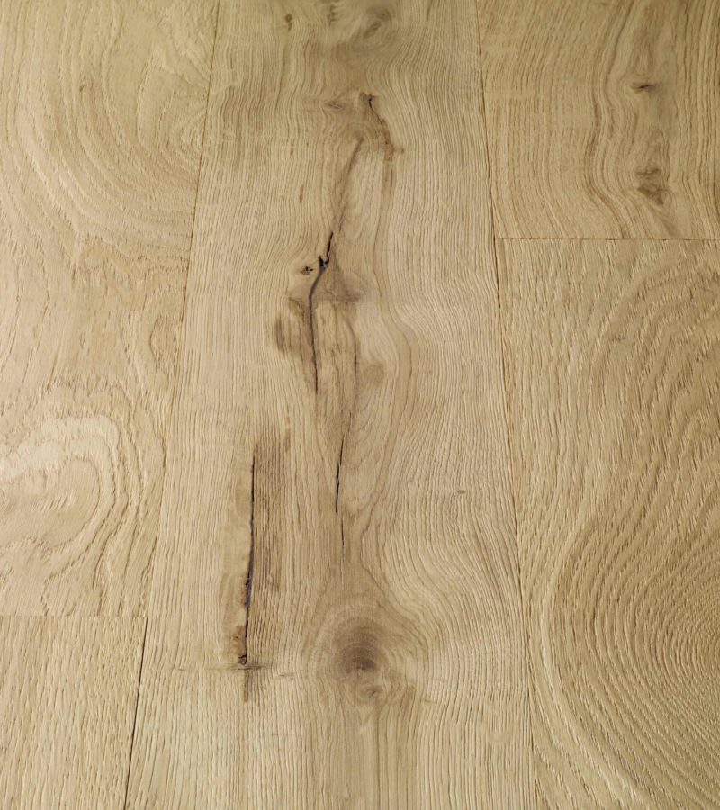 Parquet contre collé structuré fort, vernis incolore, bords ronds.