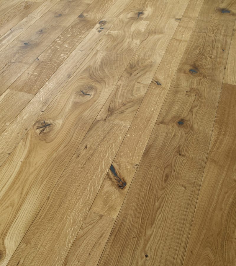 Parquet contre collé à la Française chêne campagne/sauvage, noeuds et fentes bouchés noir.