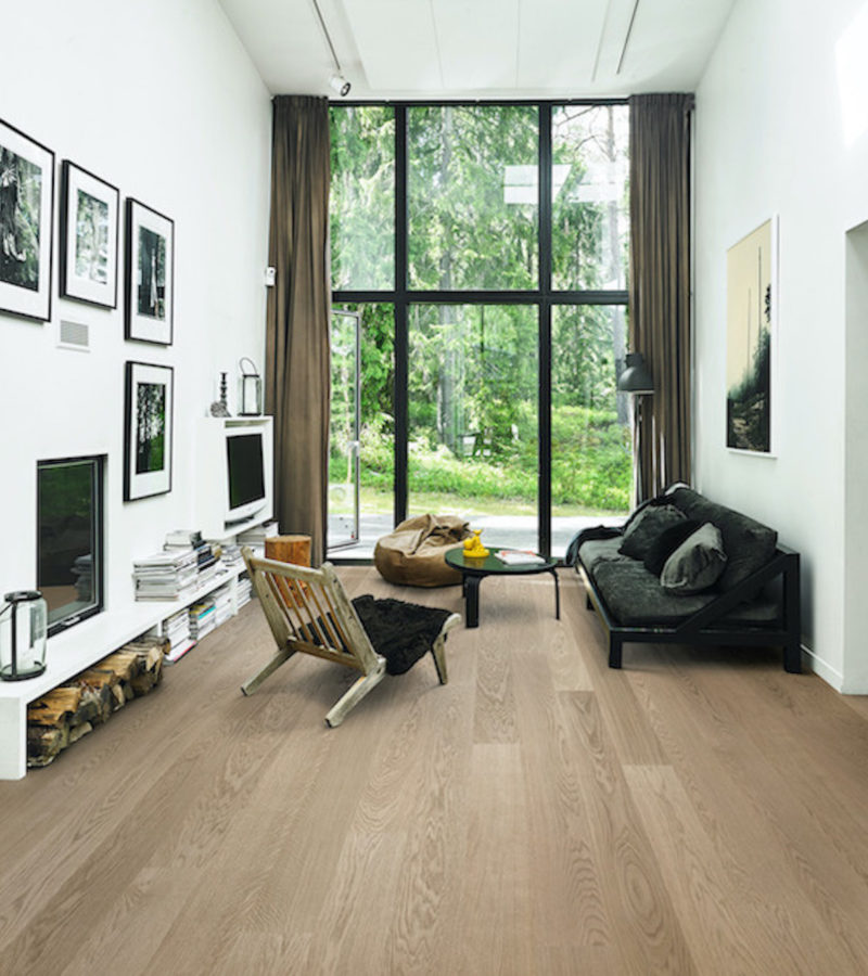 Chêne. Monolame large, légers chanfreins, brossé. Sélection Variation et Calm. Finitions Huile naturelle ou vernis ultra mat.