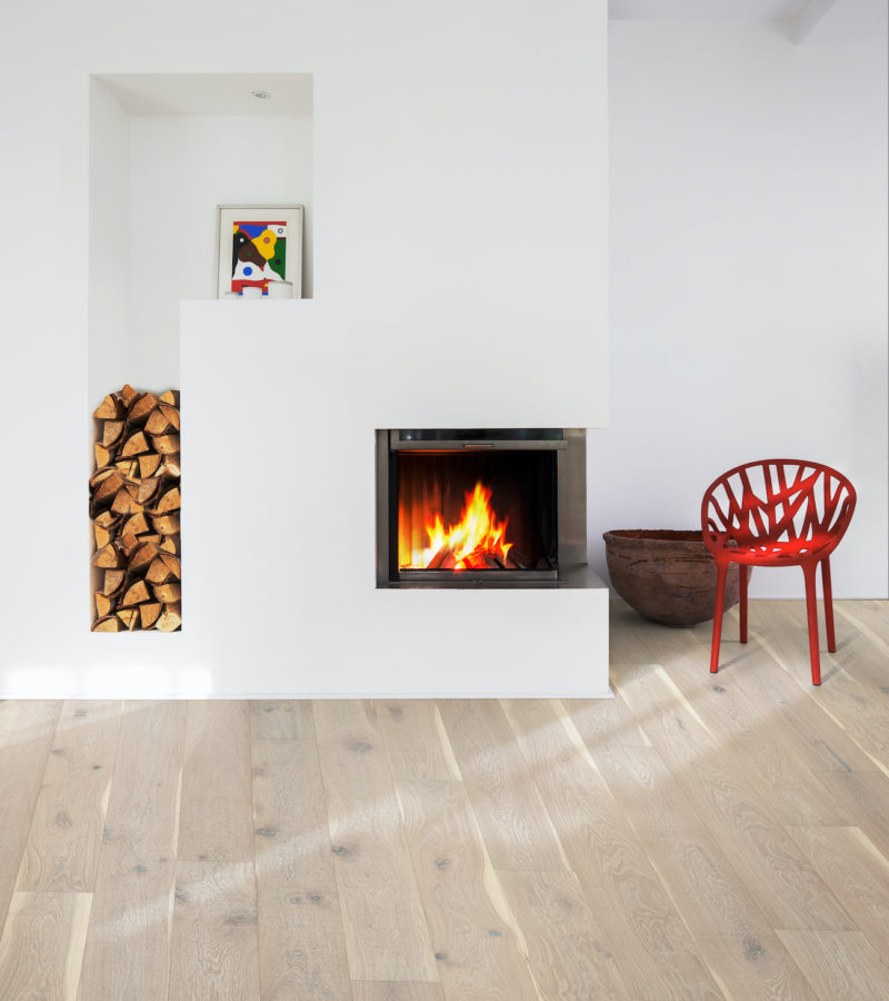 Chêne. Monolame, 1 ou 2 frises, 4 chanfreins. Vernis mat brossé, Sélection Variation et Lively.