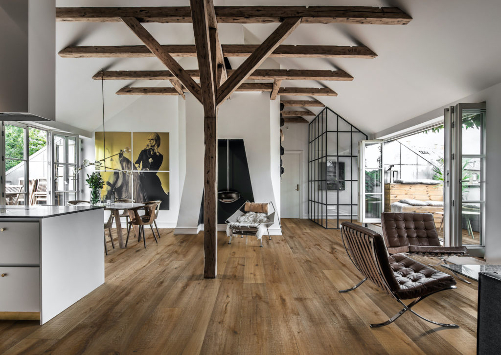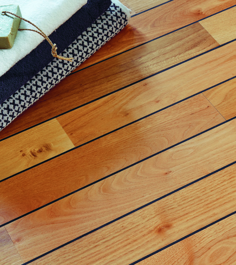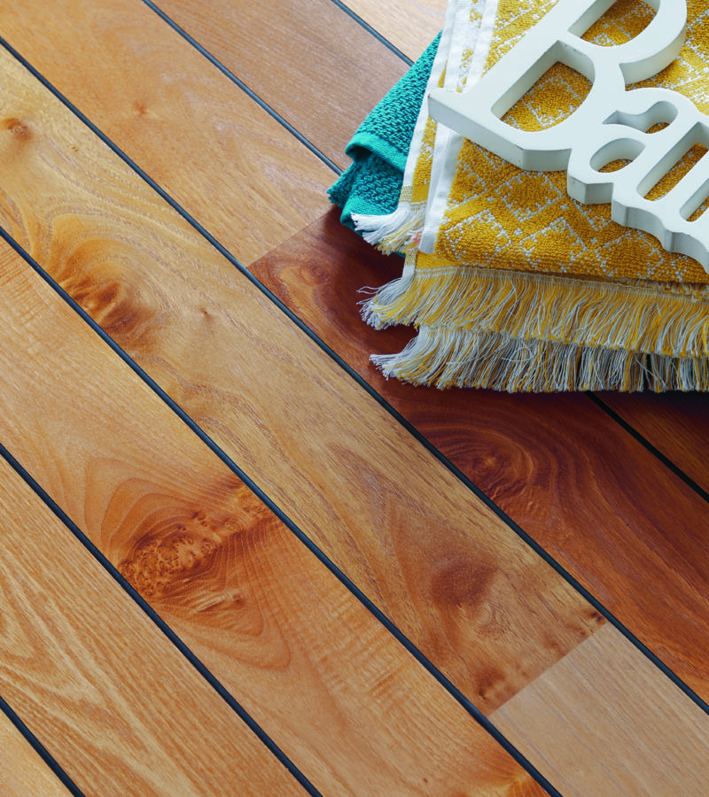 Essence encore mal connue, le robinier est un bois français qui rivalise, sans rougir, avec ses concurrents exotiques. Sa couleur naturelle jaunâtre à brun doré est étuvée puis huilée pour conserver sa teinte naturelle, et les bords des lames sont gansés d’un joint noir autocollant, rappelant le revêtement des ponts des bateaux. Souvent réservé aux pièces humides, le parquet en robinier est synonyme de confort, de bien-être et de chic.